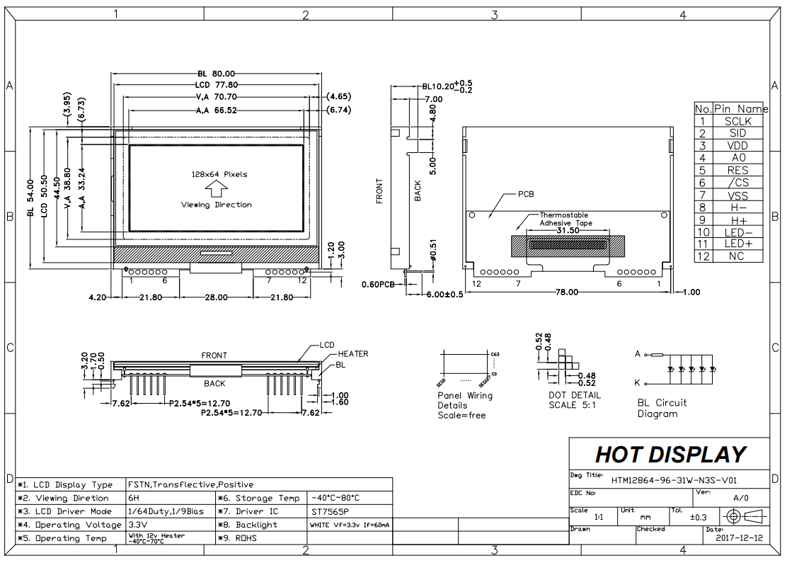 2.0 英寸 128X64 LCD 图形液晶模组/FSTN 正显/ST7567/红绿蓝背光/全透偏光片 arduino HTM12864-112-35S-A5P | 图形液晶模组 | 128x64 |