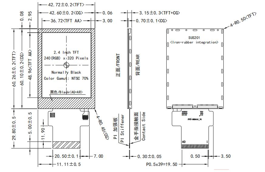 2.4 寸TFT LCD240*320高亮度抗反射显示屏IPS 全视角 ST7789 TFT-H024A1QVISTKG40 TFT显示屏 240x320 42.72 x 60.26 x 3.15 2.4 2.4 36.72 x 48.96 IPS全视角 1500 cd/m2 FPC-40PIN MCU 防静电ESD 8KV -30~80℃ 3.3V ST7789