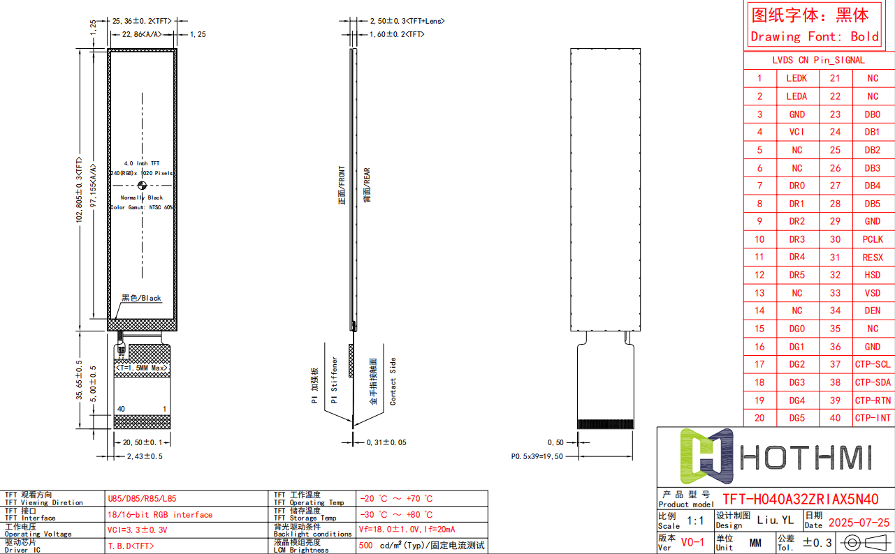 25.36x102.805x2.5 | 4.0 | 4.0 | 22.86x97.155 | IPS全视角 | 500cd/m2 | 40 PIN | RGB | 防静电ESD 8KV | -20~70℃ | +3.3 V |
